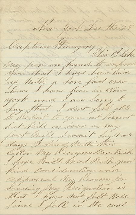 A fine group of three war-date documents and a letter related to the resignation of Third Asst. Engineer Charles Sinclair of the USS Western World. First is Sinclair's letter of resignation to his commander, Acting Master Samuel B. Gregory, 2pp. 8vo., New York, Dec. 25, [62], in part: "...I take my pen…to inform you that I have been laid up with a sore foot ever since I have been in New York…I don't feel able to report to you at present but will as soon as my foot will permit say 4 or 5 days. I send with his my letter of resignation which I hope will meet with your kind consideration…my reasons for sending my resignation is that I have not felt well since I fell in the coal hole of the Western World and…don't feel able to go to sea any more…". Second is Sinclair's resignation to the Secretary of the Navy Gideon Welles, 1p. folio, "U. S. Stmr Western World, Navy Yard, Charleston". It is interesting to note that Sinclair saw no need to inform Sec. Welles about his true whereabouts which was New York! Needless to say, Sinclair's resignation was not accepted and he showed his true colors in 1864 by deserting. The third is the Navy Department's official decline of Sinclair's resignation signed and made official by Secretary of the Navy GIDEON WELLES and Acting Rear Admiral SAMUEL P. LEE as commander of the North Atlantic Blockading Squadron. Three pieces, very good.