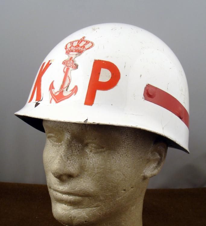 WWII "NAVY RESERVES" HELMET-WHITE WITH RED INSIGNIA * APPEARS TO HAVE BEEN CRAFTED FROM A U.S. HELMET LINER--FRONT HAS NAVY INSIGNIA, MIGHT BE DANISH