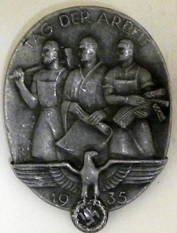HERE IS A NAZI 1935 "TAG DER ARBEIT" MEDAL WITH WORKERS. THE FRONT SHOWS WORKERS-EAGLE/SWASTIKA-1935---REVERSE IS PINBACK AND MAKER'S MARK: "CHR BAUER-WELZHEIM"