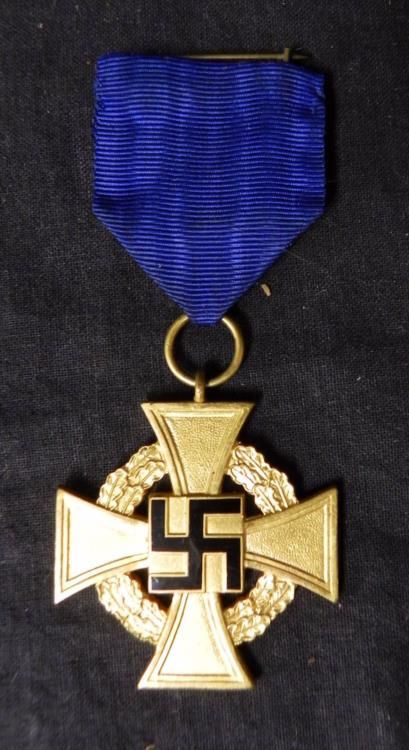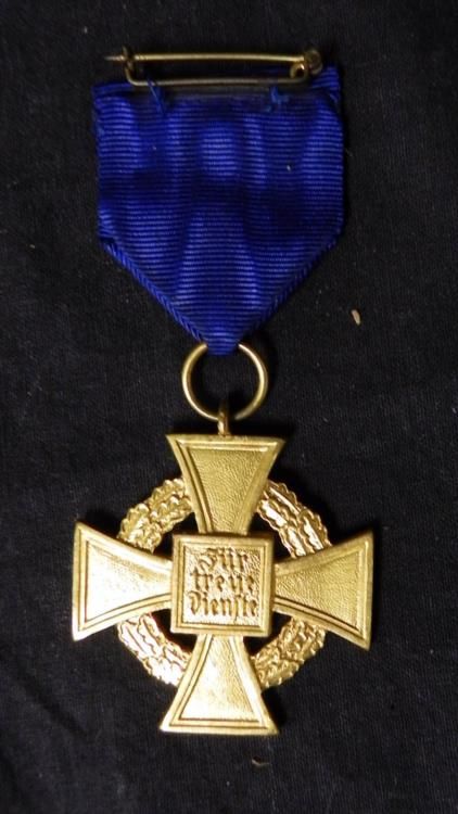 NAZI 40 YEAR FAITHFUL SERVICE MEDAL & RIBBON-ORIG-GILT-MINT COND---GREAT MINT CONDITION BRINGBACK GILT MEDAL AND LOOP-BLACK ENAMEL SWASTIKA---REVERSE "FUR TREUE DIENST"-CORNFLOWER BLUE RIBBON--ATTACHMENT CLASP