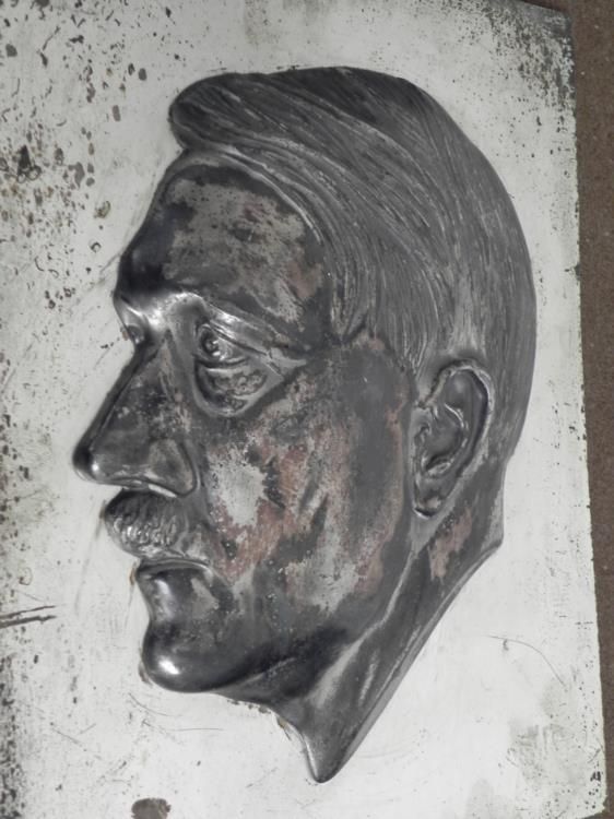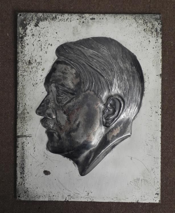 NAZI BUST PLACK OF HITLER-ORIGINAL-MOUNTED ON STEEL PLATE-RARE QUALITY PERIOD ITEM GREAT FIND, PURCHASED FROM A GERMAN LUFTWAFFE VETERAN-HAS A TWO DIMENSION LIKENESS OF ADOLF HITLER WITH OUTSTANDING DETAIL-PERIOD MOUNTED WITH SCREWS ON A STEEL PLATE BACKI