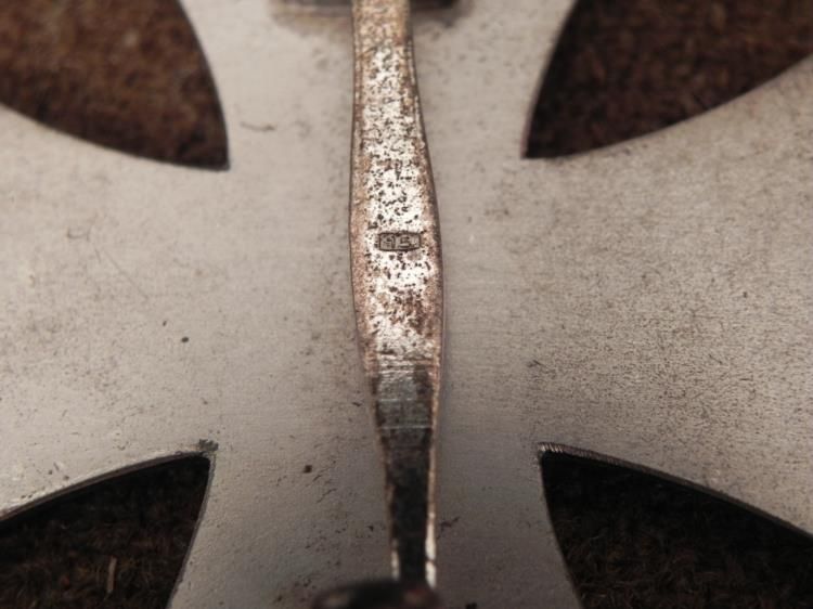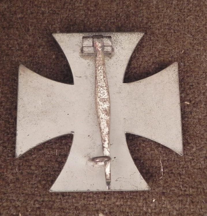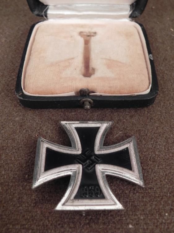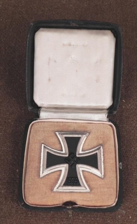 OUTSTANDING NAZI CASED IRON CROSS 1ST CLASS-MAKER "15"-BEAUTY-ORIG-MAGNETIC * * ALMOST A FLAWLESS NAZI IRON CROSS 1ST CLASS WITH ITS ORIGINAL PRESENTATION CASE--BLACK IRON CROSS CENTER OF EK1 WITH RAISED SWASTIKA AND 1939==BRIGHT FLAWLESS BORDER--MAGNETIC--FROSTED REVERSE WITH COKE BOTTLE PIN MARKED "15" AND THAT ATTRIBUTES TO THE MAKER "FRIEDRICH ORTH"--CASE SHOWS AGE AND AGE IMPRESSIONS IN SATIN INNER LID WITH AGE YELLOWING ON BOTTOM INNER FLOCKING OF CASE--CASE HAS A TENSION OPENING BUTTON, OUTLINE OF EK ON TOP--TAPE LIFTING IN A FEW SPOTS ON CASE--GUARANTEED 100% ORIGINAL--VET PURCHASE *