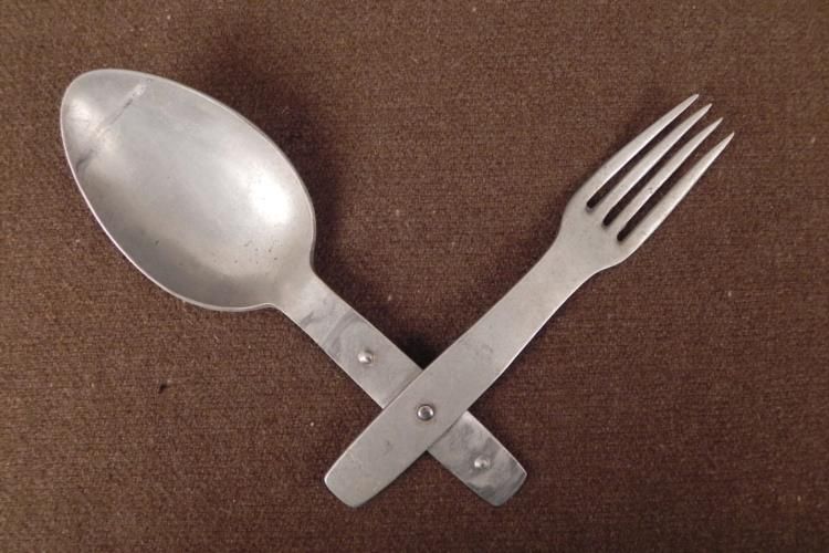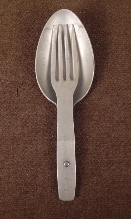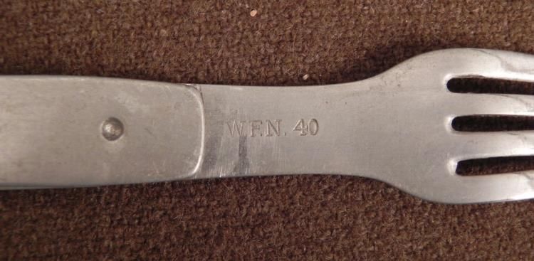 NAZI COMBAT FIELD EATING UTENSILS-SPOON & FORK SET-SWIVEL-MARKED "W.F.N. 40" BRINGBACK-FOLD TOGEHER & OPEN FOR USE--EARLY 1940 ORIGINAL