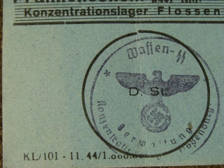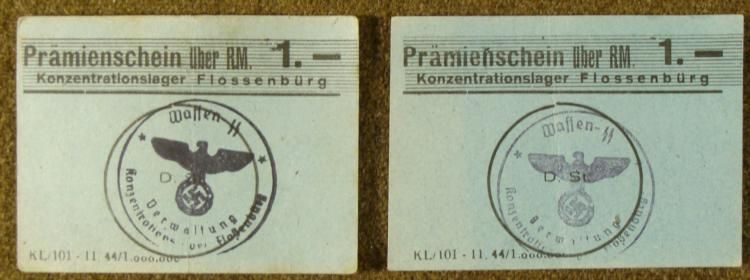 NAZI CONCENTRATION CAMP FLOSSENBURG "SLAVE LABOR" SCRIP FROM 1944-1RM-STAMPED SS * ORIGINAL 1944 CONCENTRATION CAMP FLOSSENBURG SCRIP-RUN BY WAFFEN SS--FLOSSENBURG WAS IN THE OBERPFALZ REGION OF BAVARIA, GERMANY NEAR THE CZECH BORDER * SCRIP WAS PRIMARILY ISSUED IN THE CAMPS AND SUBCAMPS THAT HAD NEARBY FACTORIES WHERE SLAVE LABOR CONTRIBUTED TO THE NAZI WAR EFFORT. The SS, WHO RAN THE CAMPS, PROVIDED THE INDUSTRIALISTS WITH AN ENDLESS STREAM OF SLAVE LABOR. THUS, ON 11 AUGUST 1944, AT THE OSRAM (ELECTRIC) WORKS, A RULING WENT INTO EFFECT THAT PERMITTED EACH WORKING PRISONER TO BE PAID THE FREE LABOR RATE OF 4 RM PER DAY. THE INMATES NEVER SAW THE MONEY, SINCE IT WAS IMMEDIATELY TAKEN BY THE SS. PRISONERS WERE OFTEN ACUTELY AWARE OF THE RELATIONSHIP BETWEEN THE SS, THE NAZI PARTY, GIANT CORPORATIONS, AND PRISON SCRIP.