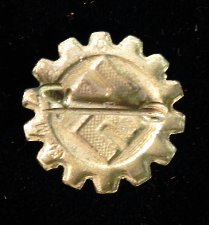 NAZI DAF/DEUTSCHES ARBEITS FRONT MEMBER PIN-MKD "RZM-M"---NICE ORIGINAL-FRONT SHOWS GEAR WITH SWASTIKA CENTER-MARKED REVERSE