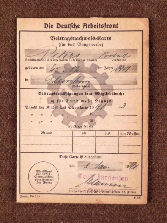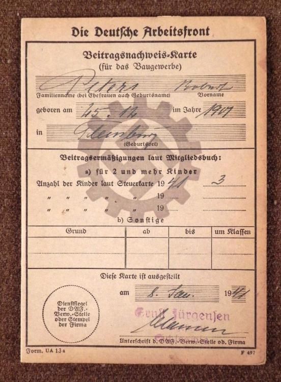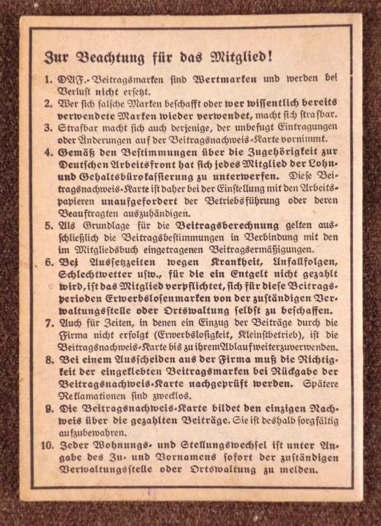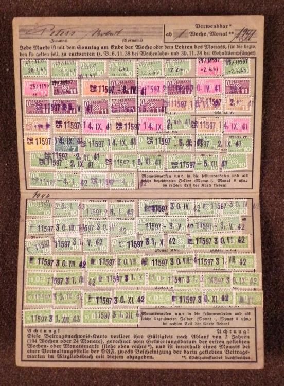 NAZI DAF/DEUTSCHES ARBEITSFRONT MEMBERSHIP &DUES BOOK-ROBERT PETERS-1941-42NAZI DAF OT/ORGANIZATION TODT MEMBERSHIP &DUES STAMPSBOOK FOR 1941-1942-FULL SIGNED &FILLED WITH DUES STAMPS