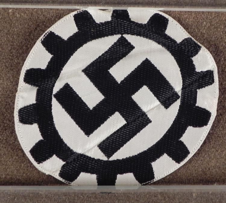 THIS IS AN ORIGINAL NAZI DAF/WORKERS FRONT INSIGNIA FROM A SPORTS JERSEY SHIRT, FROM ATHLETIC COMPETITION. IT HAS A BEVO BLACK GEAR & SWASTIKA ON SILK/RAYON, WHICH MEASURES OUT TO BE 4" IN DIAMETER. *