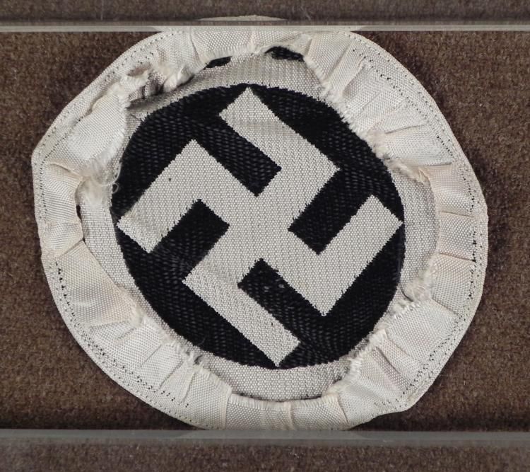 THIS IS AN ORIGINAL NAZI DAF/WORKERS FRONT INSIGNIA FROM A SPORTS JERSEY SHIRT, FROM ATHLETIC COMPETITION. IT HAS A BEVO BLACK GEAR & SWASTIKA ON SILK/RAYON, WHICH MEASURES OUT TO BE 4" IN DIAMETER. *