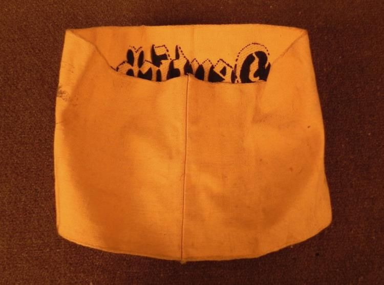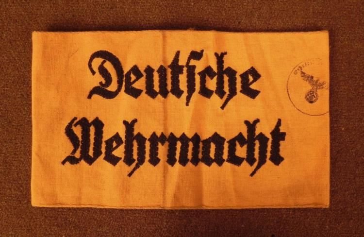 NAZI "DEUTSCHE WEHRMACHT" ARMBAND-BLACK GOTHIC LETTERS ON YELLOW W/INK STAMP-ORIG * NICE ORIGINAL NAZI ARMY ARMBAND W/CHAINSTITCHED BLACK LETTERING ON YELLOW ARMBAND-SEWN TOGETHER-EAGLE & SWASTIKA INK STAMP, HARD TO READ-RECENT VET BUY *