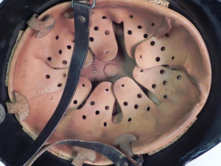 NAZI DOUBLE DECAL ORIG. FIREMAN HELMET-NEAR MINT-MARKED---THIS IS AN OUTSTANDING NAZI FIREMAN'S WAR HELMET IN NEAR MINT CONDITION-VET FAMILY PURCHASE--TOP HAS METAL FIREMAN'S COMB--LEFT SIDE HAS FIRE/POLICE INSIGNIA OF NAZI EAGLE & SWASTIKA IN OVAL WREATH--RIGHT SIDE EMBLAZONED WITH THE NAZI SHIELD IN RED WITH WHITE CENTER AND LARGE SWASTIKA-ALL IN GREAT CONDITION--INSIDE IS COMPLETE-THE LINER IS A LIGHT TAN LEATHER BEAUTY-MARKED SIZE "56"--THERE ARE LEATHER CONNECTORS FOR A NECK SHIELD--THERE IS A TOP DOME PAD IN LEATHER MARKED "DRGM 1341836"--THE FULL DOUBLE BUCKLE CHINSTRAP IS PRESENT-THIS IS A NEAR MINT SOLID NAZI HELMET-GUARANTEED ORIGINAL AND NEVER PLAYED WITH-INSIDE METAL MARKED WITH MAKER MARK "OTT---THALE" WITH INVERTED "V"