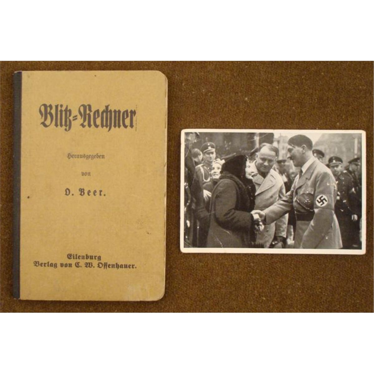 THIS IS A NAZI ERA "BLITZ-RECHNER", LIGHTNING COMPUTER MATH HC BOOK & A PHOTO OF HITLER. * HERE IS A VERY INTERESTING 4X6" HARD COVER MATH LIGHTNING COMPUTER, 100 PG BOOK USED BY MATHEMATICIANS OF THE NAZI PERIOD. THE LIGHTING COMPUTER COMES WITH A PHOTO OF HITLER GREETING AN OLD WOMAN (A CIGARETTE ALBUM PHOTO). *