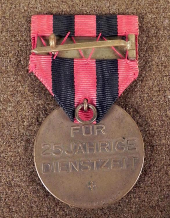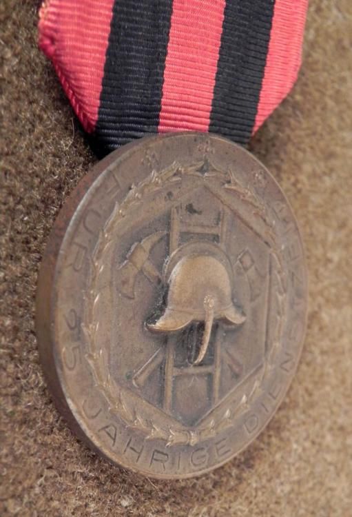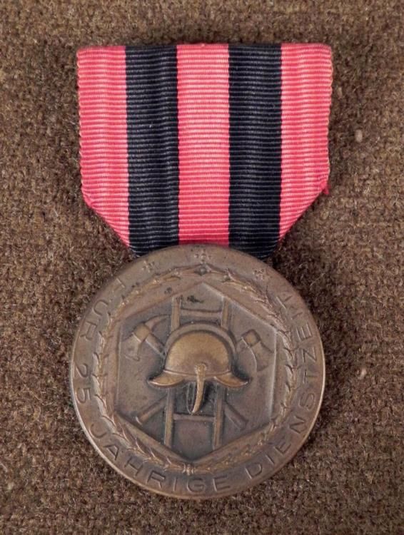 HERE IS A NAZI FIREFIGHTER'S 25 YEAR SERVICE MEDAL THAT IS MOUNTED WITH A RIBBON. ON THE FRONT THERE IS A FIRE HELMET, WITH TWO AXES CROSSED AND A LADDER BEHIND IT, AND ON THE REVERSE IT READS FUR 25 YAHRIGE DIENSTZEIT". * * * *