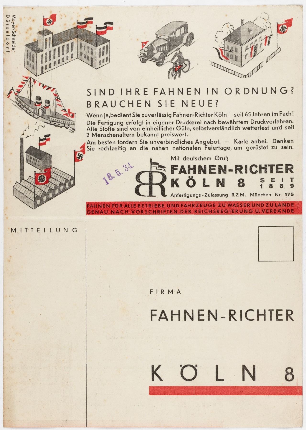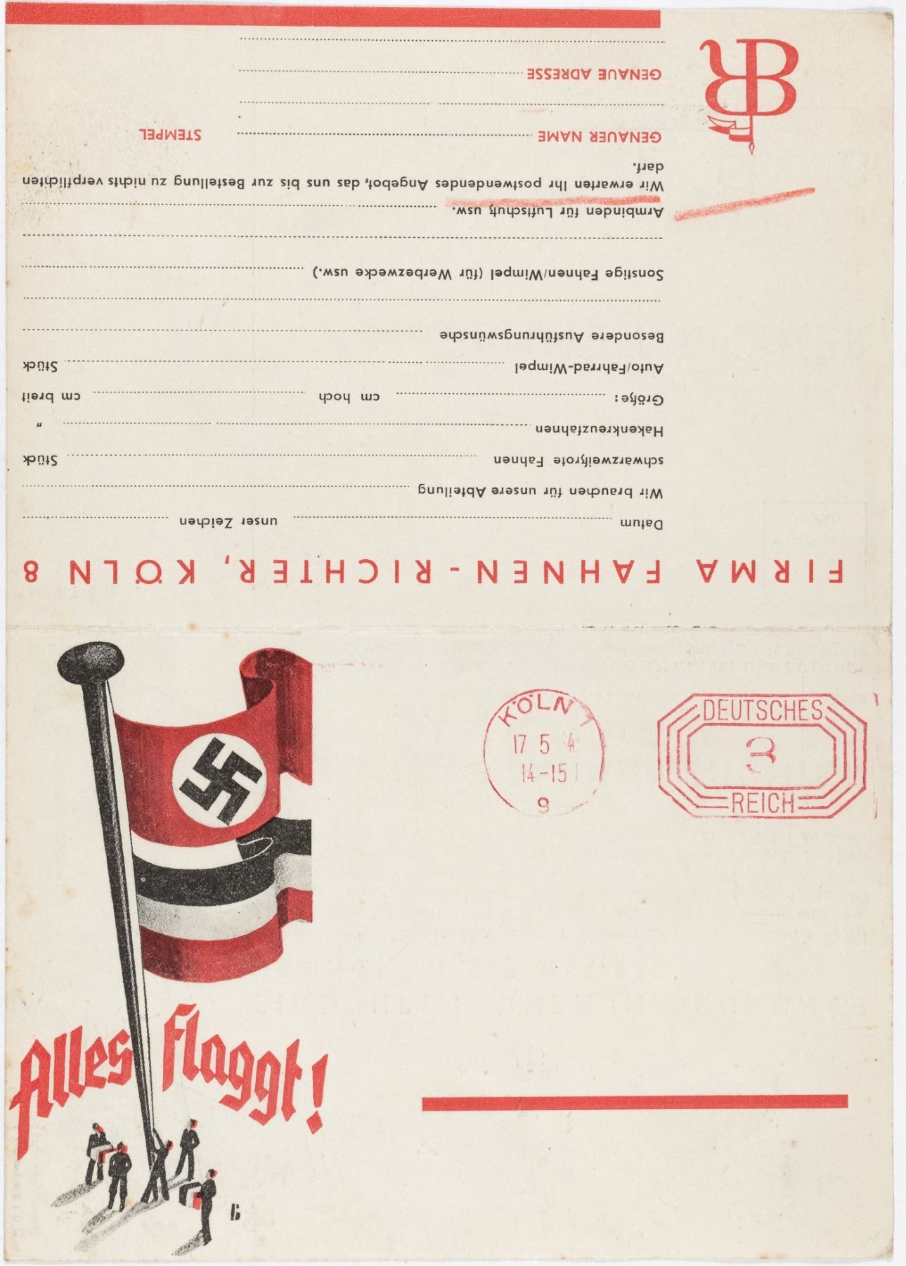 Rare unused order form for Nazi flags from the German company 'Fahnen-Richter' in Cologne. The two part mailer asks 'Are your flags in good order? Do you need replacements? On the order form are several options for black-white-red flags, swastika flags, size requests (proof that flags did not have to conform to standard sizes), special requests, other flags and pennants for advertising, armbands for air raid protection (we never encountered any Fahnen-Richter marked armbands). A receiving stamp dates the card to 1934. A great piece of ephemera for any flag collector. Unused. 8.25 x 5.75 inches. Very good.