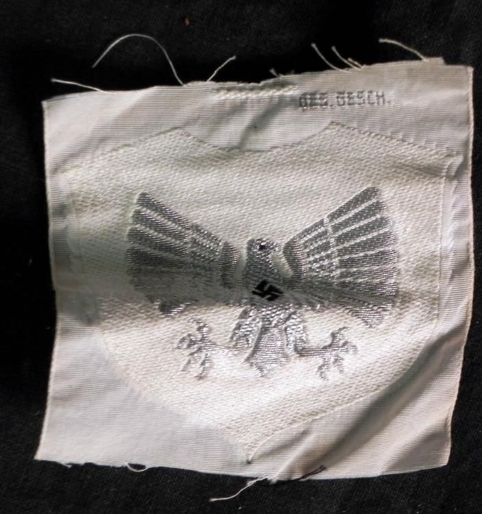 NAZI FOREIGN LEGION SHIELD SLEEVE PATCH-MKD GES SESCH---NAZI SPREAD WINGED EAGLE PATCH IN SILVER BULLION WITH BLACK SWASTIKA ON CHEST--UN-ISSUED-"GES GESCH" ON TOP-PATCH IS 3"X3"