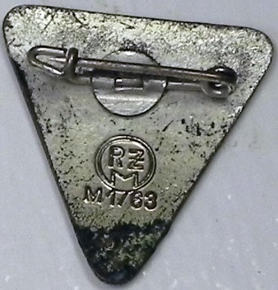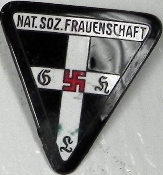 OFFERED HERE IS A NAZI FRAUENSCHAFT LEADER'S MEMBERSHIP BROOCH/PIN. IT HAS A BLACK ENAMEL WITH REVERSED TRIANGULAR MEDAL--NAZ SOZ FRAUENSCHAFT (WOMEN'S NAZI ORGANIZATION)--THERE IS A SWASTIKA IN THE CENTER IN RED--REVERSE IS PINBACK WITH MAKER'S MARKS: "RZM-M1/63.