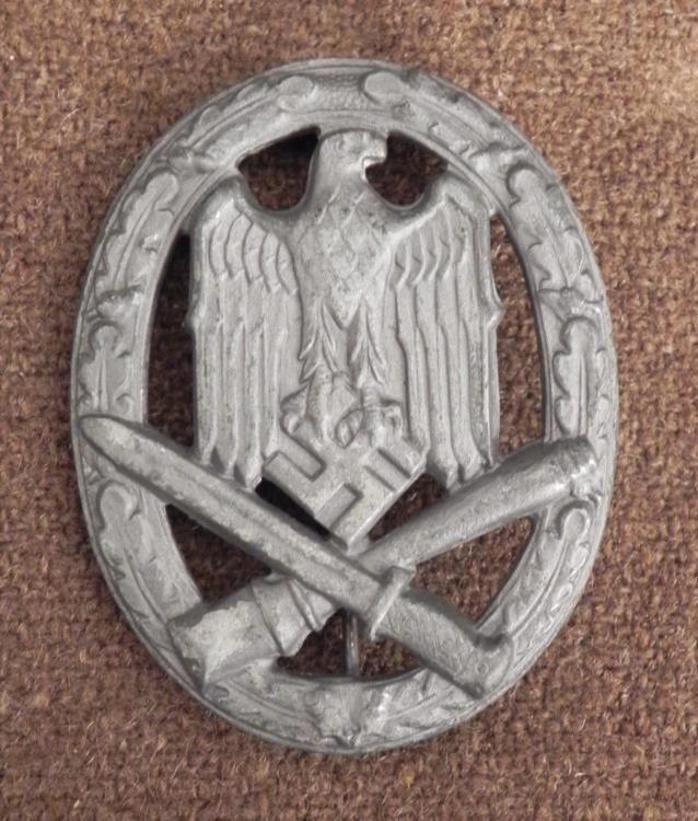 NAZI GENERAL ASSAULT BADGE FOR THE WEHRMACHT-GRADE 1-SOLID BACK-ORIG * * NICE NAZI ARMY GENERAL ASSAULT BADGE/ALLGEMEINES STURMABZICHEN--GETTING HARDER TO COME BY--NICE ORIGINAL-SOLID CONSTRUCTION TYPE--PIN BACK WITH CATCH *