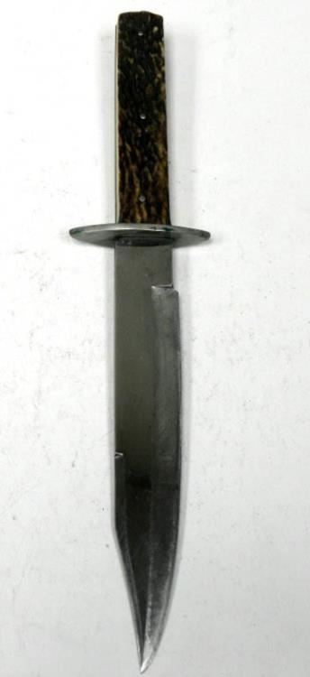 NICE ORIGINAL NAZI GERMAN BOOT KNIFE/FIGHTING KNIFE WITH A GREAT STAG GRIP--TRIPLE RIVET GRIP--BRIGHT BLADE WITH LOWER PORTION SHARPENED--SMALL BLOTCH TOWARD LOWER SPINE--BLADE 6 1/4" LONG--O/A 10".