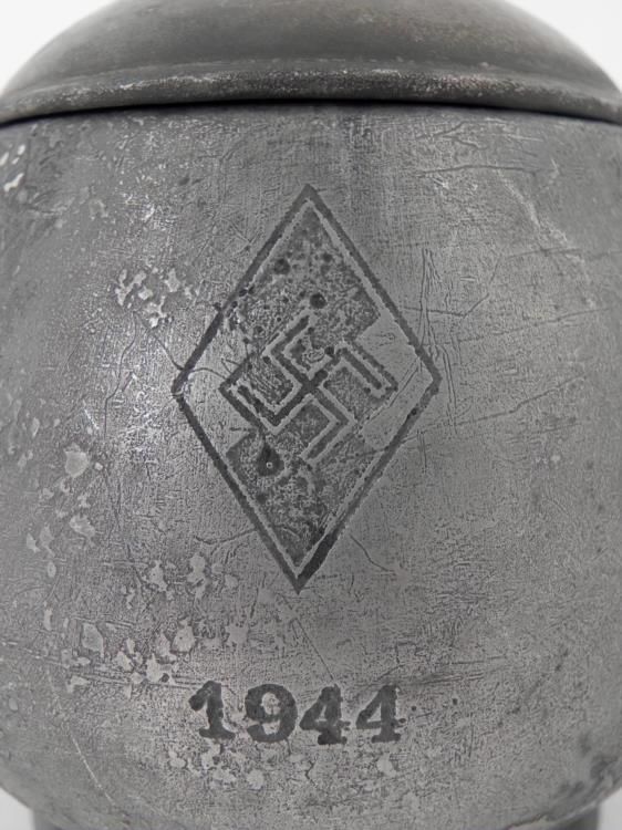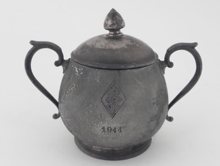 NAZI HITLER YOUTH HIGH LEADER'S DINING HALL 1944 LARGE SERVING BOWL-W/ENGRAVED "HJ" DIAMOND OUTSTANDING WAR BRINGBACK-A LARGE LATE-WAR DINING HALL SUGAR BOWL WITH TOP LID AND SIDE HANDLES-A LARGE ENGRAVED HITLER YOUTH DIAMOND WITH CENTER SWASTIKA AND DAT