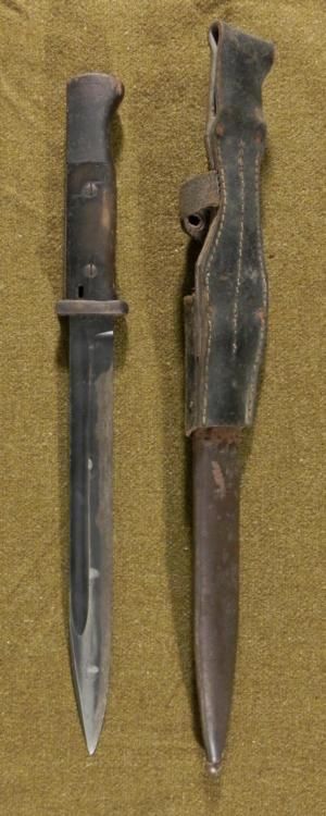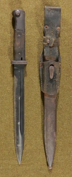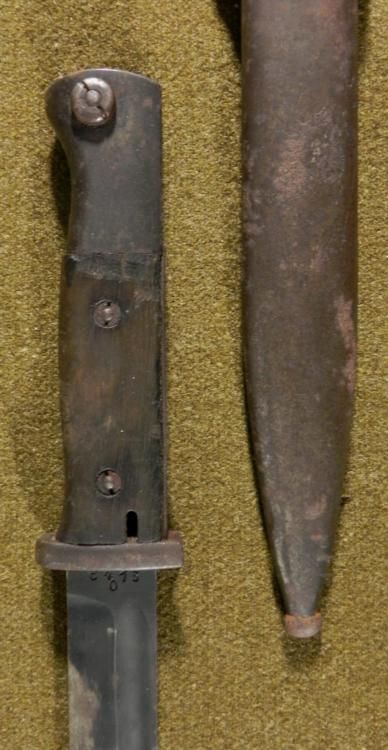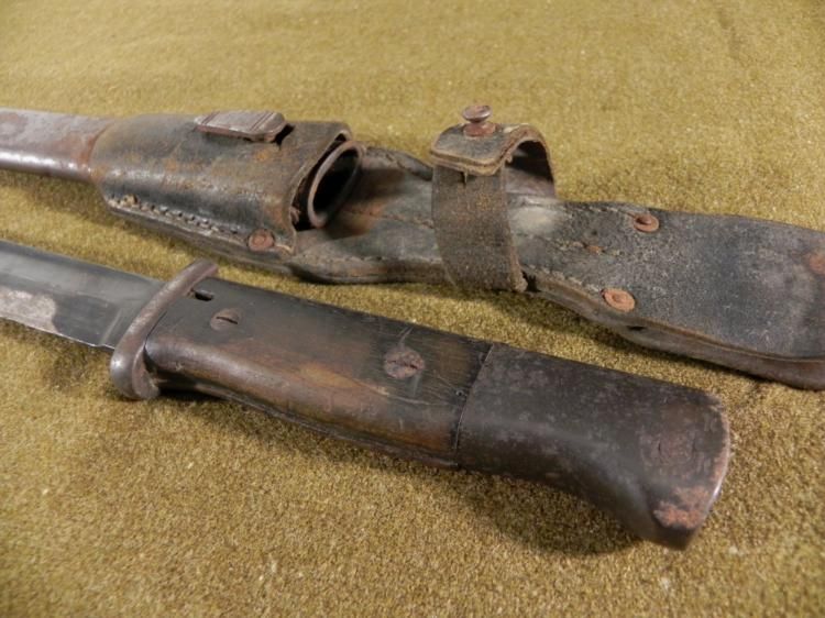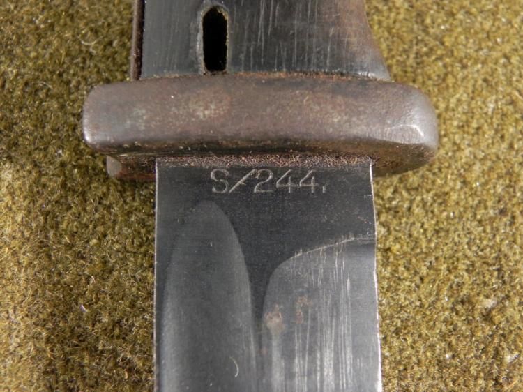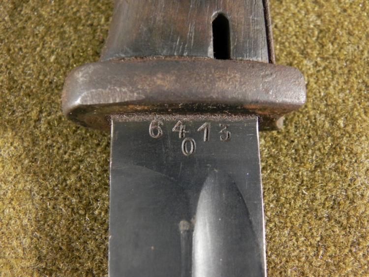 NAZI K98 COMBAT BAYONET/SCABBARD/FROG-BLADE SPINE MKD 1936-NICE EARLYORIGINALWOOD GRIPS--BLUED BLADE MARKED 6413-O AND S/244-MATCHING #'S ON SCABBARD--SCABBARD PRESENT-LEATHER FROG MARKED OFG (?) -1942--FIELD SHARPENING TO BLADE-GREAT ORIGINAL VET BRINGBACK