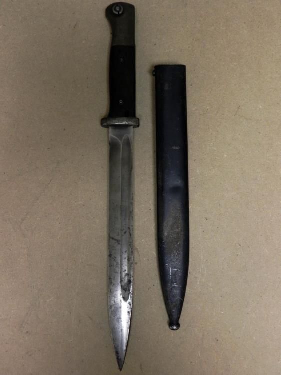 HERE IS A NICE ORIG 98K COMBAT BAYONET--WALNUT GRIPS-RELEASE BUTTON OD POMMEL WORKS FINE--WAFFENAMT ON BACK OF POMMEL--9 7/8" BLADE--BLADE 'S SPINEIS DATED "38"--DULL BLACK PAINTED SCABBARD WITH TOP SCREW PRESENT--SCABBARD NOT #'D--GREAT COMBAT BAYONET FOR THE K98 RIFLE.