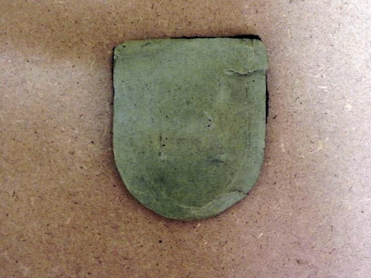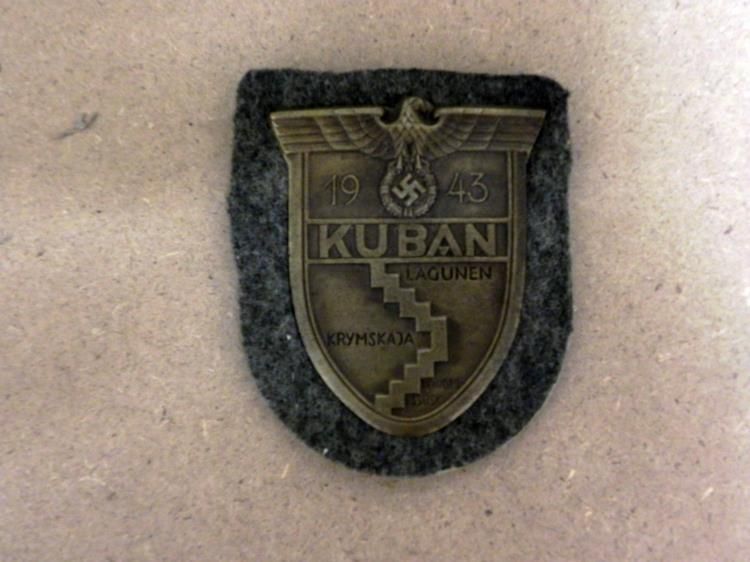 OFFERED HERE IS A NAZI KUBAN SHIELD-1943-GREY WOOLBENEATH SHIELD FOR SEWING ON UNIFORM-ORIGINAL PAPER BACKING--KUBAN SHIELD WITH EAGLE/SWASTIKA ON TOP-MAGNETIC-GUARANTEED ORIGINAL.