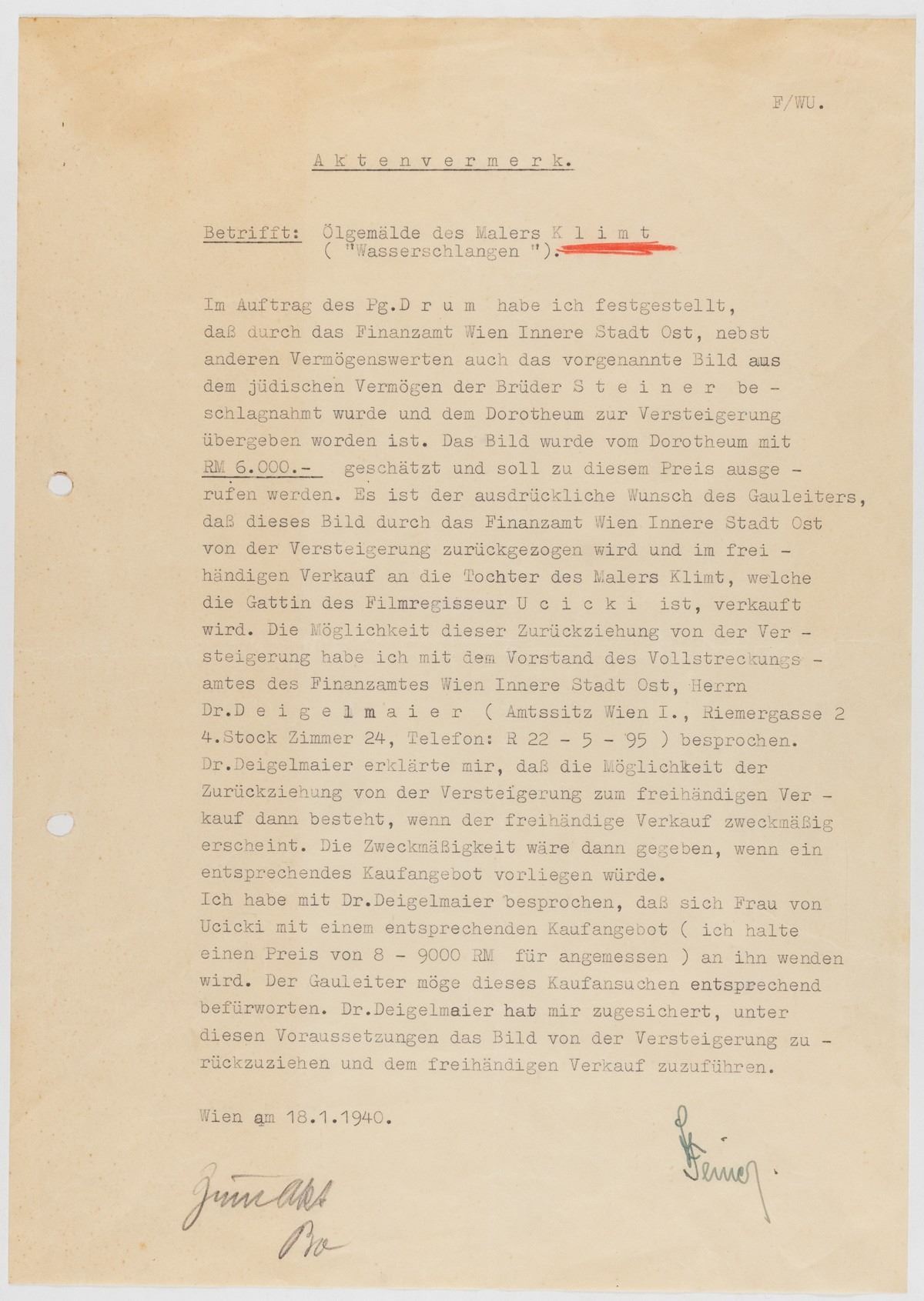 Scarce German document dated Vienna, 18. 1.1940, detailing the provenance of Gustav Klimt's 'Water Serpents II'. File notice, reading in part: 'Regards: Oil painting of painter Klimt 'Water Serpents'. On order by 'Party comrade Drum' I noticed the revenue service in Vienna confiscated the Jewish assets of the Steiner family and the aforementioned painting was handed over to the Dorotheum [Auction House] for sale. The Dorotheum estimated the painting at 6,000 Reichsmark. Under the expressed wish of the Gauleiter [Josef Burckel], that the painting shall be removed from the sale by the revenue service and sold in a free sale to the daughter of Klimt, wife of film director 'Ucicki'...' An official from the revenue service, Dr. Deigelmaier, cleared the withdrawal of the painting from the sale, if there is an offer to buy it. Deigelmaier and the author discussed that 'Frau Ucicki' will come with a buyout offer. The author recommends that a good price for the piece is between 8,000-9,000RM. Gauleiter Burckel will approve the sale and Deigelmaier guarantees the piece will be removed from the Dorotheum. This document allows the Nazis to essentially 'clean' the sale of the painting so they may 'keep' it under legitimate means. The painting was eventually given to the Nazi film director Gustav Ucicky, the purported illegitimate son of Klimt. Ucicky went on to marry Ursula Ucicky (nee Kohn), in 1957. Following Gustav Ucicky's death in 1961, Ursula inherited his whole collection of Klimt paintings. In 2012, Ursula negotiated with the rightful heirs of the Klimt painting, the Steiners, to divide the painting's profits evenly. The painting went up for auction at Sotheby's and was sold to an art collector for $112 million dollars.