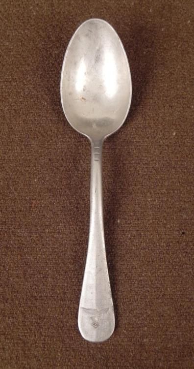 NAZI LUFTWAFFE MESS HALL SPOON-W/LUFT EAGLE/SWASTIKA-1939 & MARKED * 5 3/4"--ORIG--ALUMINUM-LUFTWAFFE EAGLE & SWASTIKA ON HANDLE--REVERSE MARKED "HMZ 39" AND "FLUV" *