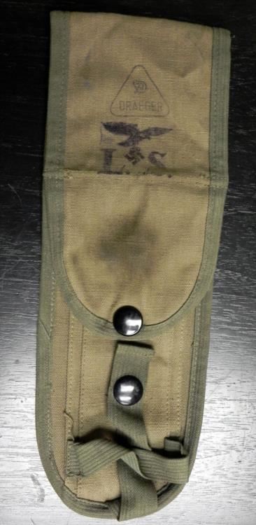 OFFERED HERE IS A NAZI LUFTWAFFE OXYGEN EQUIPMENT CANVAS CARRIER. IT HAS A DOUBLE SNAP ENCLOSURE -STAMPED WITH LARGE LUFTWAFFE EAGLE & SWASTIKA WITH "LS" ON SIDE-ALSO THE WORD "DRAEGER" IS IN TRIANGLE WITH LOGO--DRAEGER WAS THE COMPANY THAT AIR PURIFIED HITLERS BUNKER.