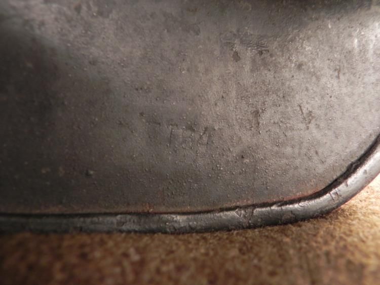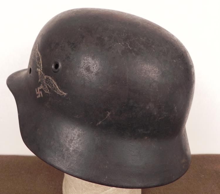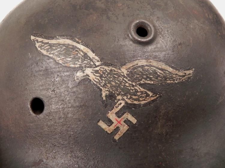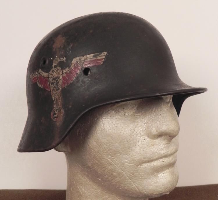NAZI M40 COMBAT HELMET W/PERIOD HAND PAINTED LUFTWAFFE AND POLITICAL EAGLES * * INTERESTING RARE ORIGINAL M40 NAZI HELMET-ROLLED RIM-INSIDE BACK STAMPED "17" AS CONTROL NUMBER AND SIDE STAMPED "ET64"--LEFT SIDE OF HELMET HAS HAND PAINTED LUFTWAFFE EAGLE WITH WING TILTED UPWARDS, CLUTCHING SWASTIKA--RIGHT SIDE HAS HAND PAINTED ELONGATED NAZI EAGLE AND SWASTIKA-AGED WHITE EAGLE WITH RED HIGHLIGHTS AND DARKENED AROUND SWASTIKA. EXTREMELY WELL DONE -AND DEFINITELY PERIOD-ART WORK ON THIS ORIGINAL HELMET-NO LINER-AN INTERESTING PERIOD GERMAN ENHANCED VARIANT *