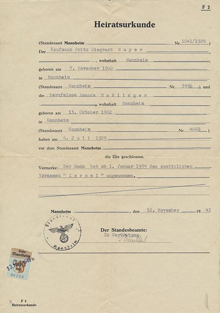 Partly-printed document 1p. 4to., Mannheim, Nov. 12, 1941, a marriage certificate between one Fritz Kaufmann and Amanda Hasslinger, and noting at bottom that, according to Nazi law that required Jewish men and women to add "Israel" and "Sarah" (respectively) to their given names, Kaufmann has to add "Israel" to his name. Nazi stamp at bottom, light wear, very good.