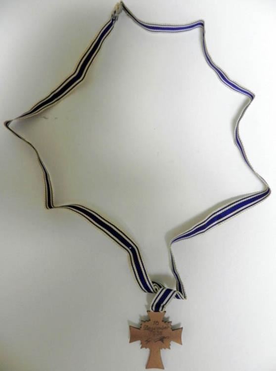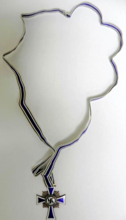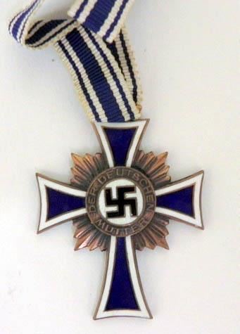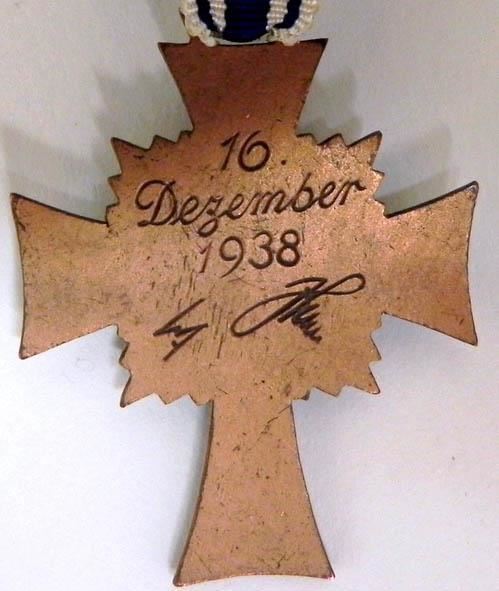 HERE IS A NAZI MOTHER'S CROSS FOR HAVING BABIES - "DER DEUTSCHEN MUTTER". IT IS A FULL SIZE MEDAL AND RIBBON-ALL ORIGINAL--REVERSE DATED "16 DEZEMBER 1938" WITH HITLER'S SIGNATURE.