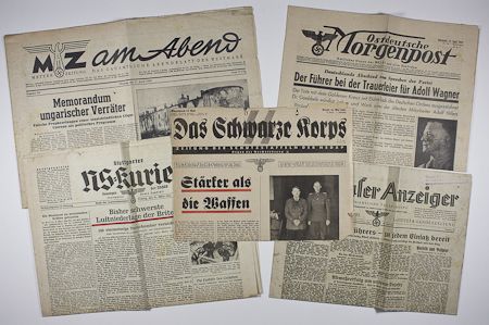 Lot of five World War II-era German newspapers, sone scarce. Includes: Das Schwarze Korps, the official paper of the SS, May 22, 1941, 4pp. (incomplete), put picturing and featuring SS-Haupsturmfuhrer Fritz Klingenburg, noted for his succesful assault on Belgrade. Trimmed at margins, file holes at top; Metzer Zeitung am Abend, an occupation newspaper printed in Metz, Apr. 11, 1944; Stuttgarter NS-Kurier, Stuttgart Mar. 31, 1944 with a cover story describing a huge destruction of a British air attack; Ostdeutsche Morgenpost, Mittwoch, Apr. 19, 1944, the cover story covering the funeral of Adolf Wagner; and Cottbusser Anzeiger", Cottbus, Apr. 20, 1944 (Hitler's birthday), the headline reading: "Alongside the Fuhrer - always ready". The paper additionally bears an ink stamp indicating that this copy is a free sample for soldiers only. Overall very good.