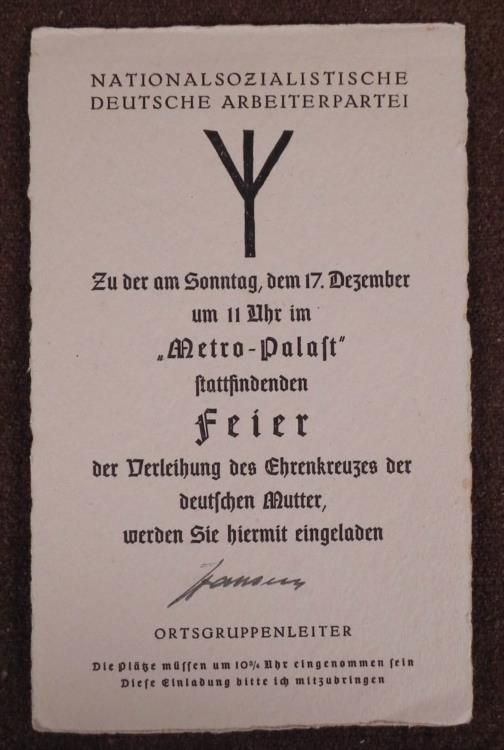 NAZI NSDAP DER DEUTSCHEN MUTTER AWARD DOCUMENT-SIGNED ORTSGRUPPENLEITER * RARE ORIGINAL EXCELLENT MOTHERS CROSS DOCUMENT SIGNED BY THE ORTSGRUPPENLEITER OF THE TOWN UPON PRESENTATION-6 1/4 X 3 3/4"
