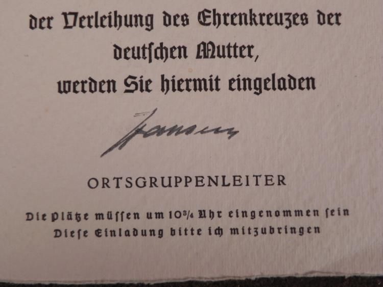 NAZI NSDAP DER DEUTSCHEN MUTTER AWARD DOCUMENT-SIGNED ORTSGRUPPENLEITER * RARE ORIGINAL EXCELLENT MOTHERS CROSS DOCUMENT SIGNED BY THE ORTSGRUPPENLEITER OF THE TOWN UPON PRESENTATION-6 1/4 X 3 3/4"