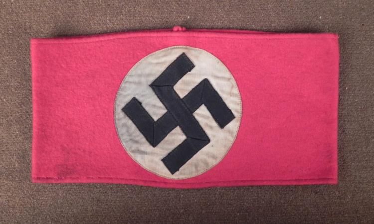 NAZI/NSDAP EARLY PARTY ARMBAND--MULTI-PIECE CONSTRUCTION--PARTIAL RZM TAG SOME SOILING TO RIBBED CENTER DISC--WOOL WITH MULTI-PIECE CONSTRUCTION-PARTIAL RZM TAG--BECOMING HARD TO FIND ORIGINAL NAZI/NSDAP ARMBANDE