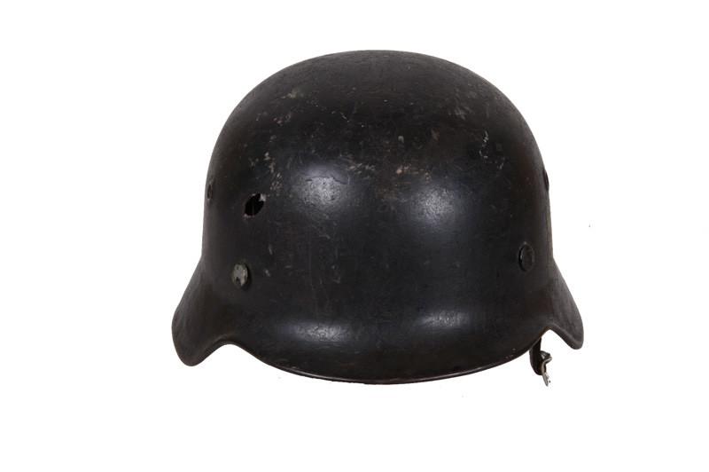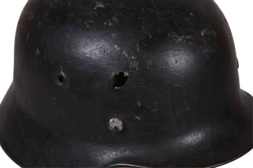 NAZI Naval Helmet Missing the Liner "K.H.Bode" marked inside helmet, gold naval ensignia located on the side, and what appears to be a bullet hole in the side."K.H.Bode" marked inside helmet, gold naval ensignia located on the side, and what appears to be a bullet hole in the side.