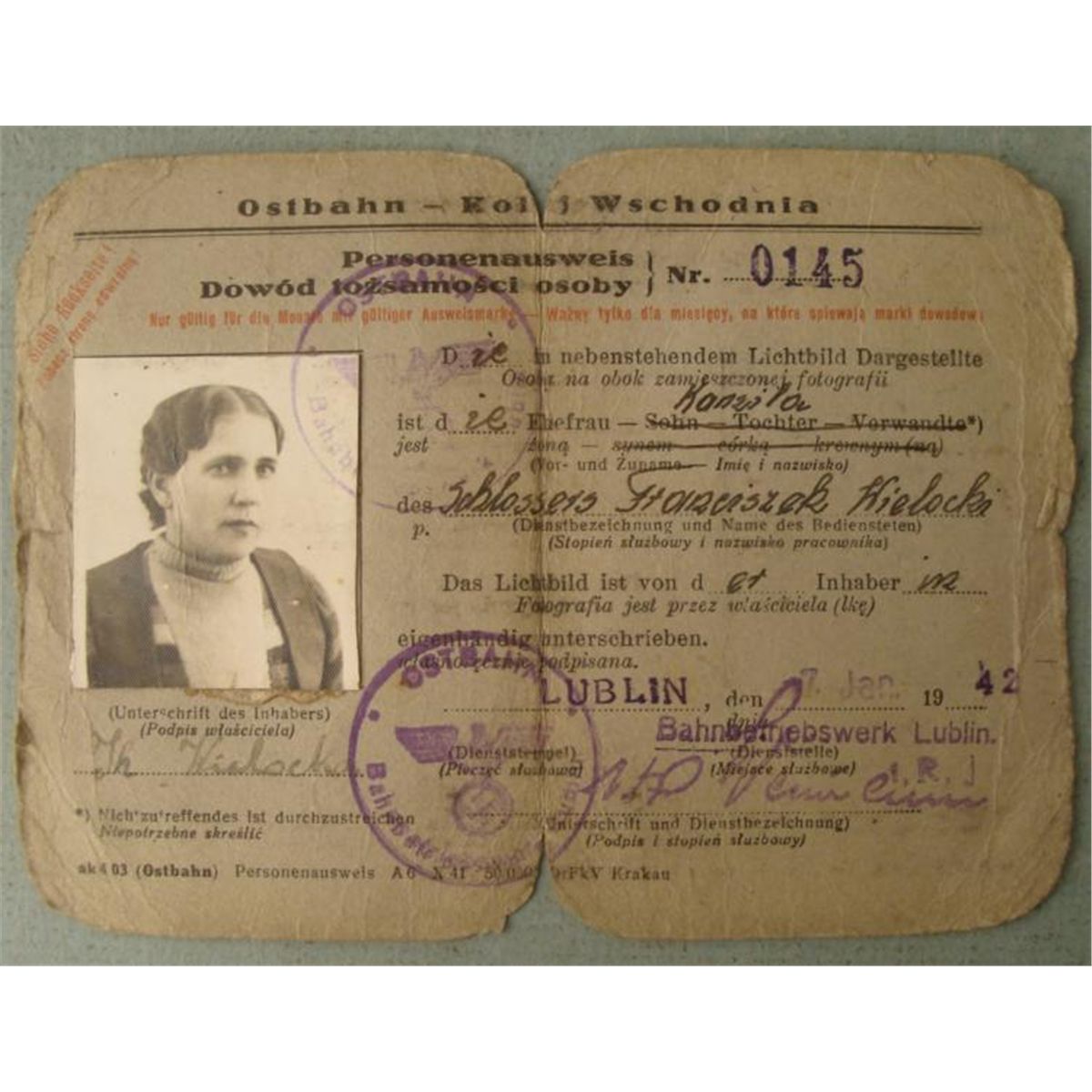 THIS IS A OLD NAZI ISSUED OSTBAHN KOLEJ WSCHODNIA IMPERIAL RAILWAY WORKERS I.D PASS. IT COMES WITH PHOTO, NAZI STAMPED, AND NAZI DUES STAMPS. IT IS ON CARDBOARD PAPER AND IS A TOTAL OF FOUR PAGES. *