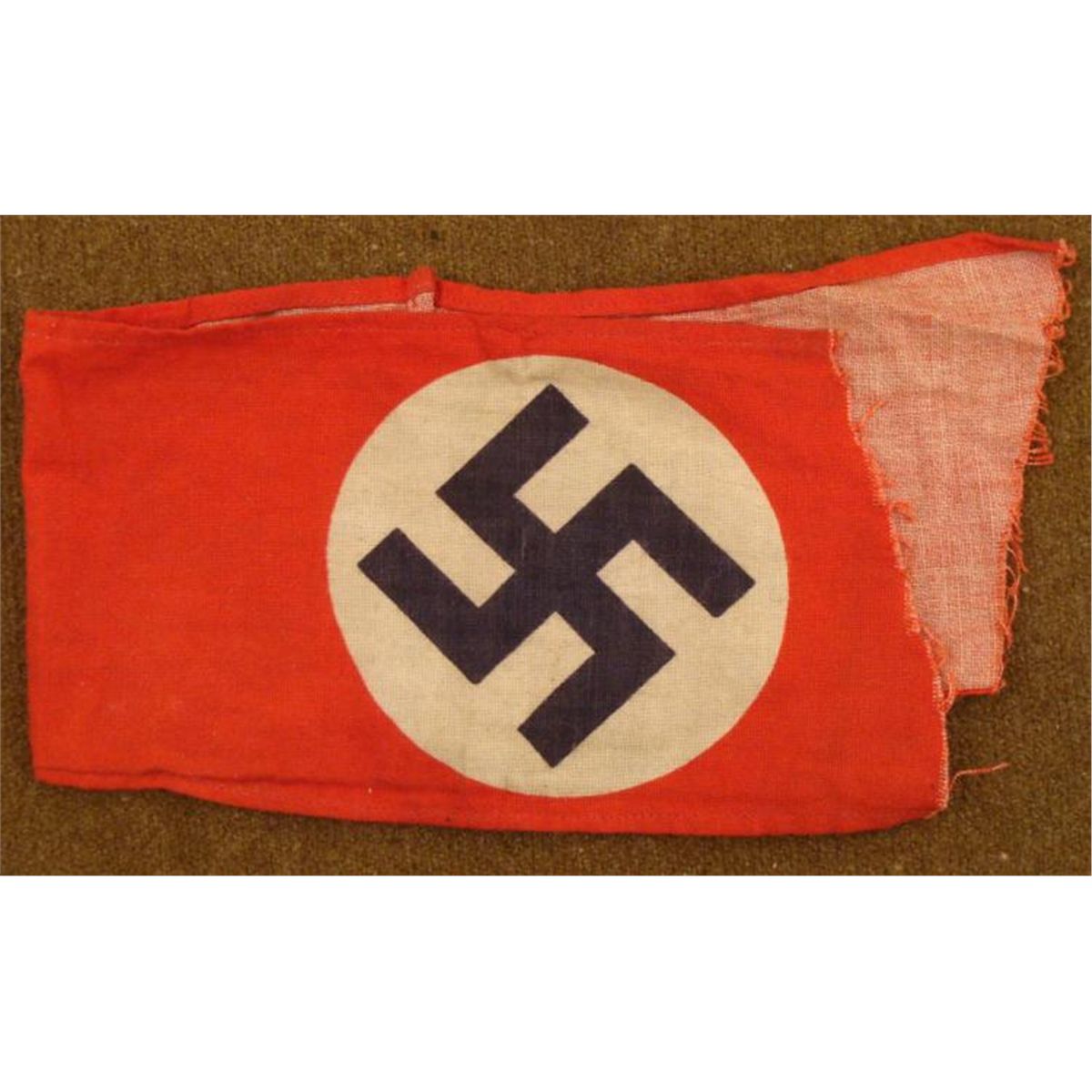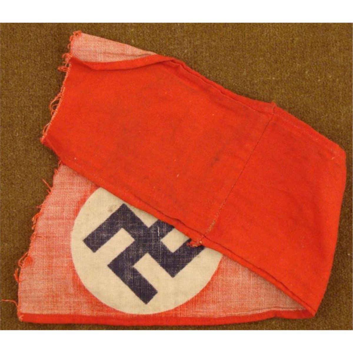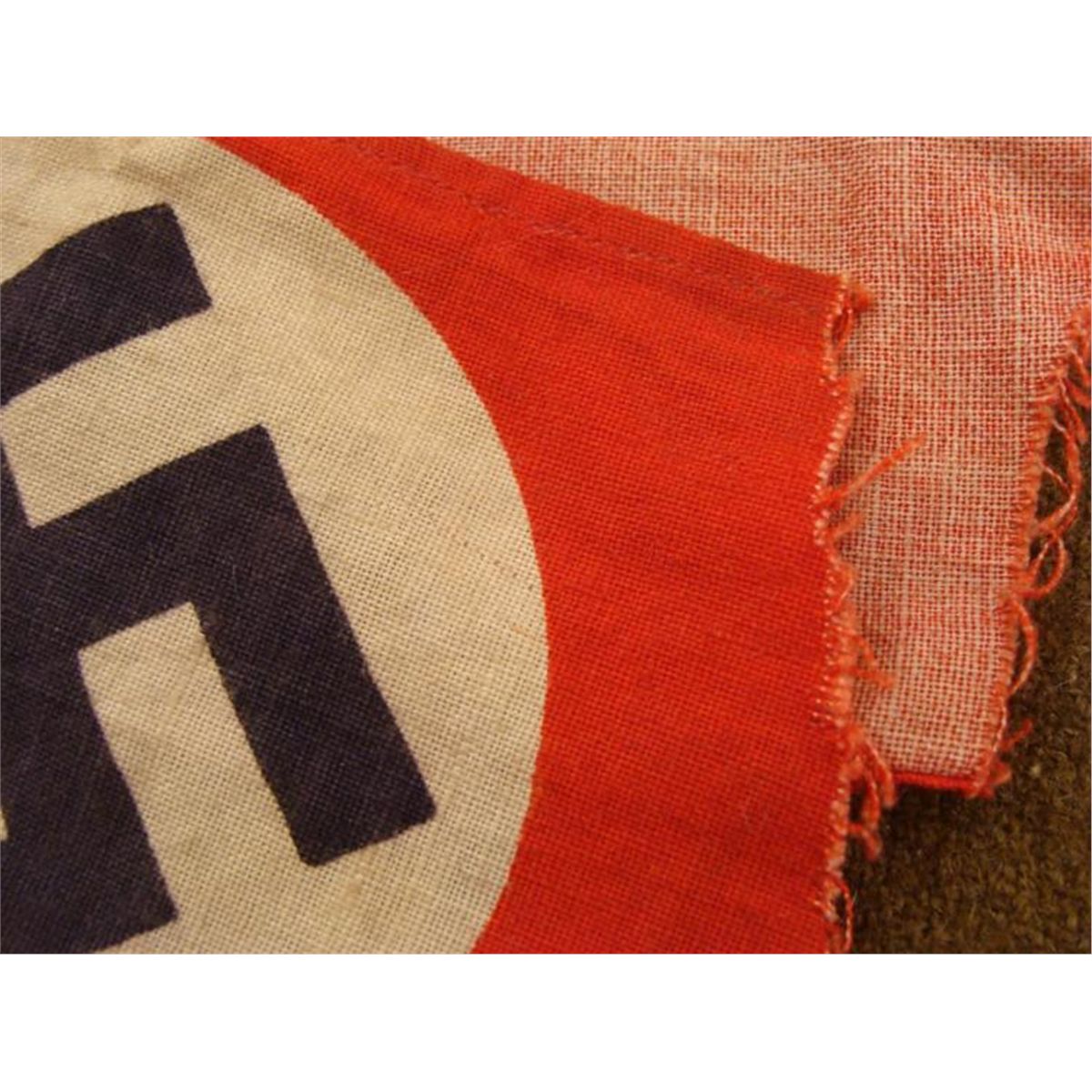 NAZI PARTY ARMBAND-NSDAP-ORIG-RIPPED OFF NAZI BY G.I. AND SENT HOME * 13"--ORIGINALLY SEWN ON ARM-WAS RIPPED OFF-LATER PRINTED VERSION-GREAT HISTORICAL PIECE *