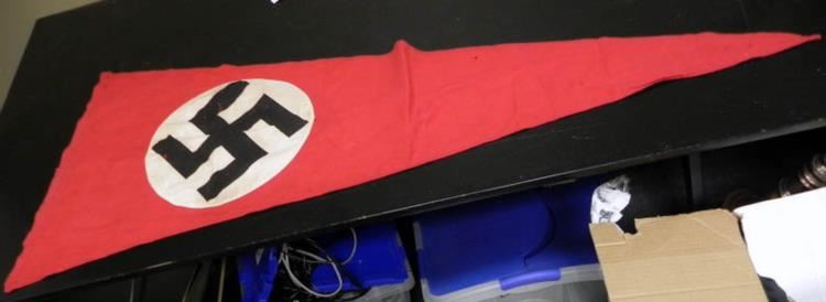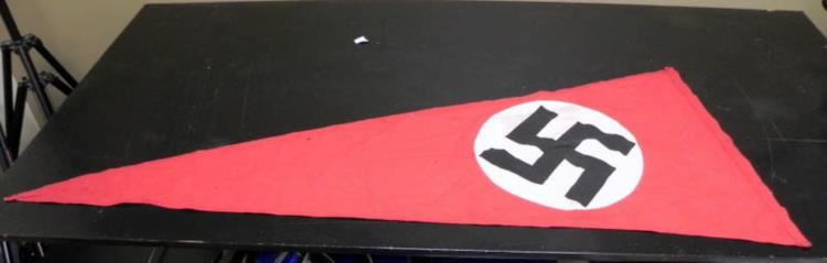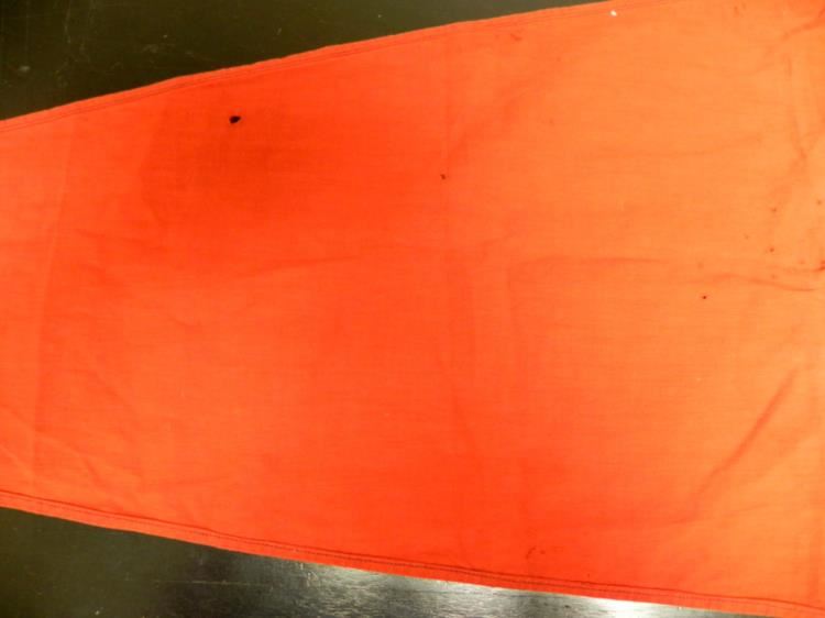 HERE IS A NAZI PENNANT-ORIGINAL-DOUBLE SIDED--54" LONG-22" WIDE ON TOP. THIS GREAT RARE ORIGINAL NAZI PARTY PENNANT--MULTI-PIECE CONSTRUCTION--LARGE 54X22"--RED WITH WHITE CIRCLE & SWASTIKA--SOME STAINING TO WHITE CIRCLE AND SOME MOTH NIPS
