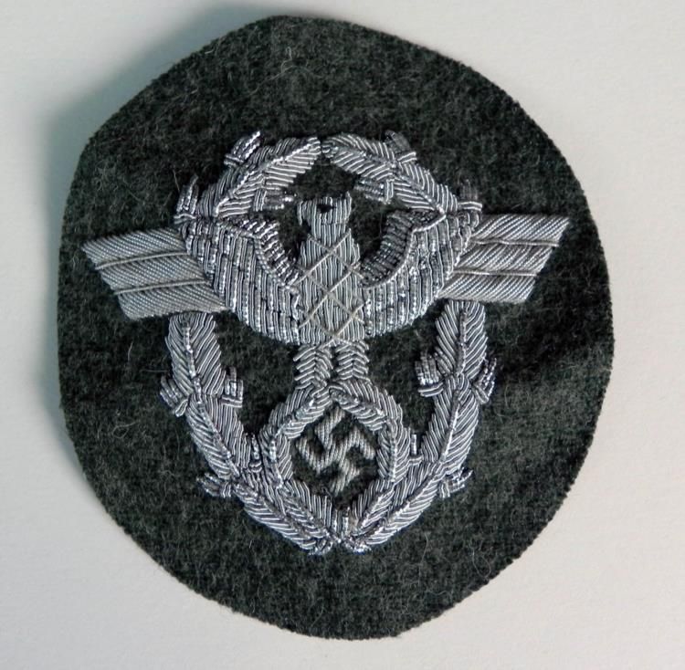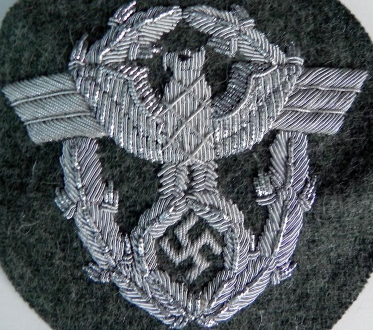NAZI POLICE OFFICERS POLICE SLEEVE INSIGNIA - SILVER BULLION WOOL ---3.25" X 3.75" - SILVER EMBROIDERED POLICE EAGLE AND SWASTIKA IN WREATH - HAS DARK BACKING