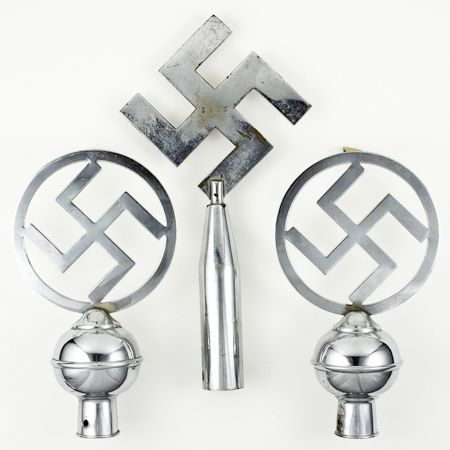 Lot of three pre-1933 flag pole tops, two bearing an encircled swastika atop a cylinder, the third a more solid chromed brass swastika marked "1933" at center, scuffed. Three pieces.