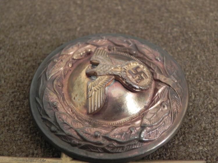 NAZI  RARE JUSTICE OFFICIAL'S BELT BUCKLE *  * GOLD WASHED HEAVY METAL-WITH OAK LEAF BORDER & EAGLE WITH SWASTIKA CENTER--REVERSE MARKED "SS-DRGM"=BUCKLE AND GOLD WASH SHOW WEAR *
