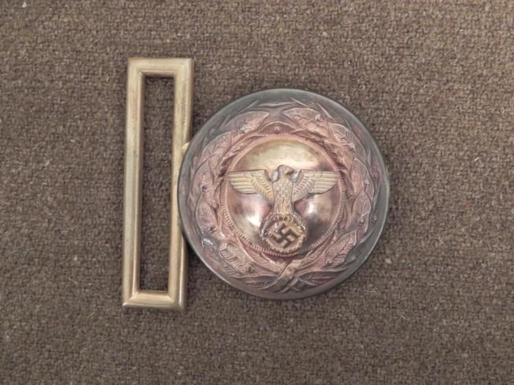 NAZI RARE JUSTICE OFFICIAL'S BELT BUCKLE GOLD WASHED HEAVY METAL-WITH OAK LEAF BORDER & EAGLE WITH SWASTIKA CENTER--REVERSE MARKED "SS-DRGM"=BUCKLE AND GOLD WASH SHOW WEAR