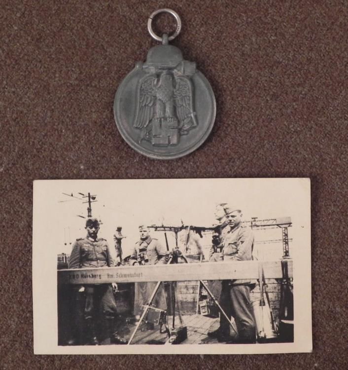 NAZI RUSSIAN FRONT MEDAL & PIC OF NAZI SECURITY AT NURENBURG W/MACHINE GUN2 NICE ORIGINAL PERIOD ITEMS-MEDAL HAS HELMET & GRENADE ON TOP-EAGLE & SWASTIKA CENTER-REVERSE "WINTERSCHLACT IM OSTEN 1941/42---2 1/2 X 3 3/4" ORIG PHOTO OF WEHRMACHT GUARDS IN NURNBURG