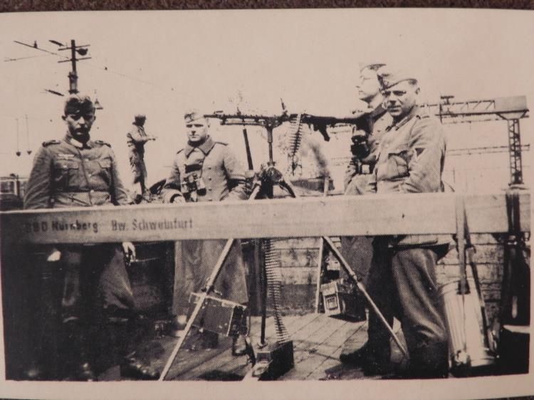 NAZI RUSSIAN FRONT MEDAL & PIC OF NAZI SECURITY AT NURENBURG W/MACHINE GUN2 NICE ORIGINAL PERIOD ITEMS-MEDAL HAS HELMET & GRENADE ON TOP-EAGLE & SWASTIKA CENTER-REVERSE "WINTERSCHLACT IM OSTEN 1941/42---2 1/2 X 3 3/4" ORIG PHOTO OF WEHRMACHT GUARDS IN NURNBURG