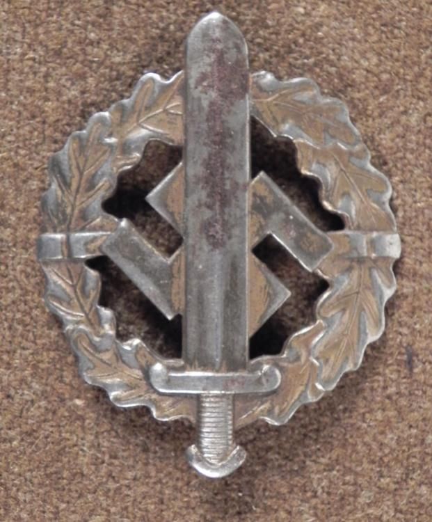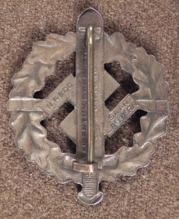 HERE IS A EARLY ORIGINAL NAZI S.A. SPORTS BADGE WITH WREATH SWASTIKA & SWORD. ON THE REVERSE IT IS MARKED, EIGENTUMDOBERSTEN SAEFUHRUNG SAAR-LAUTERN. *