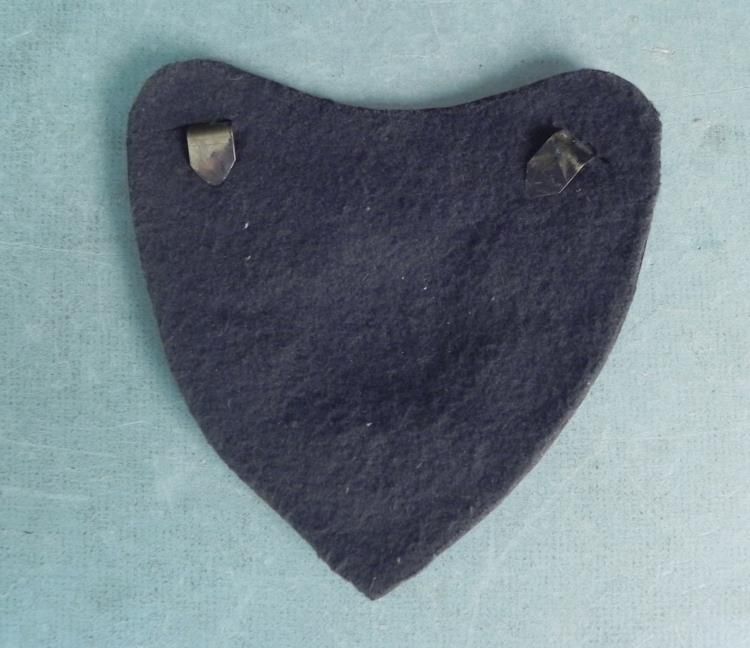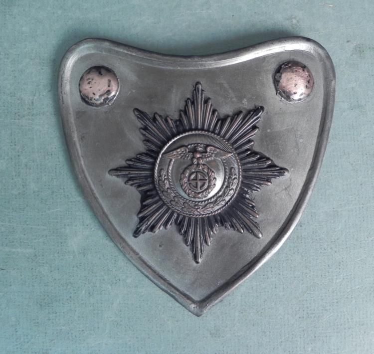 NAZI SA/STORMTROOPER PARADE GORGET-SA INSIGNIA & STARBURST IN CENTER HEART SHAPED NAZI SA GORGET--WITH SA INSIGNIA IN STARBURST-BUTTONS ON TOP SIDE-BROWN WOOL REVERSE WITH 2 CLIPS FOR CHAIN--CHAIN NOT PRESENT--SHOWS AGE AND DAMAGE