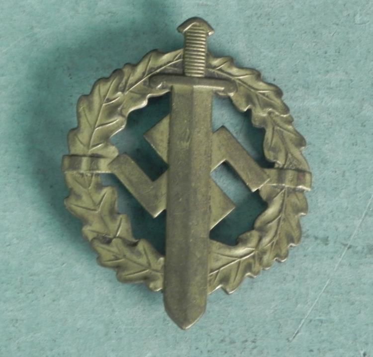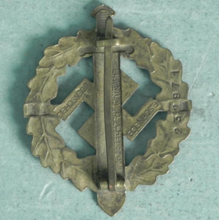 NAZI SA/STORMTROOPERS SPORTS BADGE-NUMBERED ORIGINAL BRONZE OAK LEAVES WITH SWORD AND SWASTIKA--HARD TO FIND SA NUMBERED STAMPED INTO BACK "232971"--MAKER MARKED ":E. SCHNEIDER-LUDENSCHEID"--EIGENTUM D. CHEFS D-AUSBUILDENSWEISEN