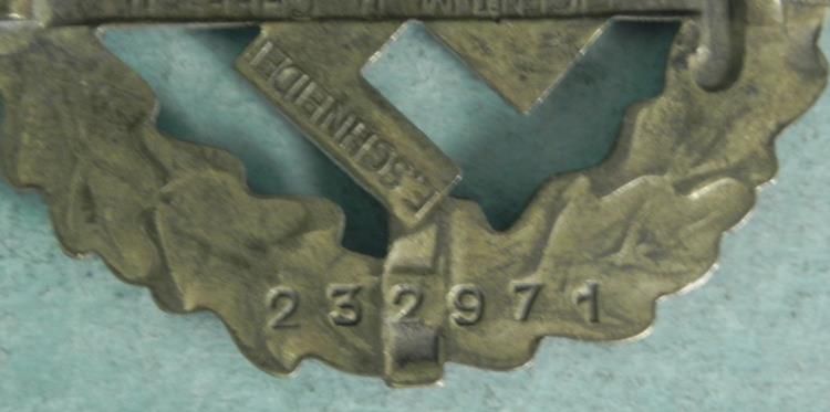 NAZI SA/STORMTROOPERS SPORTS BADGE-NUMBERED ORIGINAL BRONZE OAK LEAVES WITH SWORD AND SWASTIKA--HARD TO FIND SA NUMBERED STAMPED INTO BACK "232971"--MAKER MARKED ":E. SCHNEIDER-LUDENSCHEID"--EIGENTUM D. CHEFS D-AUSBUILDENSWEISEN