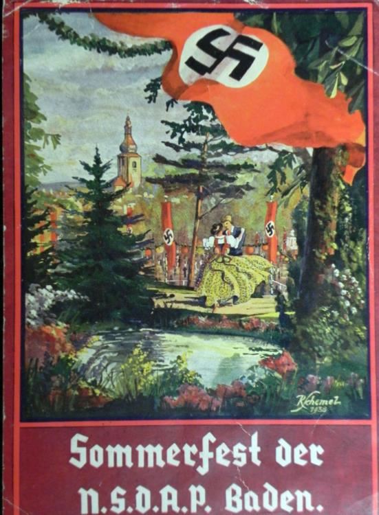 OFFERED HERE IS A NAZI SOMMERFEST DER NSDAP COLOR FLYER. THE ARTWORK IS DATED AND IS 7/38"--SHOWS COUPLE DANCING SURROUNDED BY NAZI FLAGS--GREAT ORIGINAL PROPAGANDA FLYER FROM BADEN GERMANY.